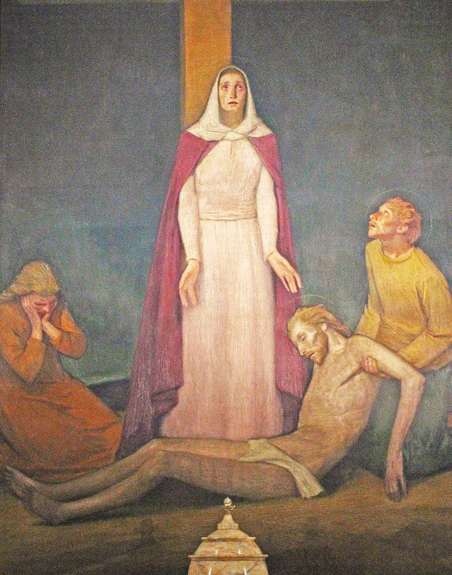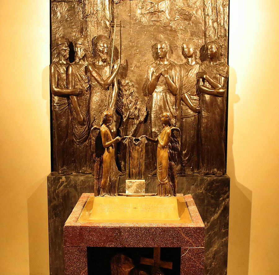 As mentioned before, the fresco on top of the altar depicts Saint Babila and the three boys (Urban, Prilidianus and Epolonio, sons of Teodula) with whom he was martyred, under the rule of Emperor Decius in 250 AD, and is the work of Luigi Cavenaghi, well known Italian painter. The baptismal font, decorated with angels holding the silver robe resting on a quartz block is as well a great piece of art. [2]