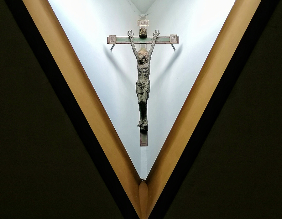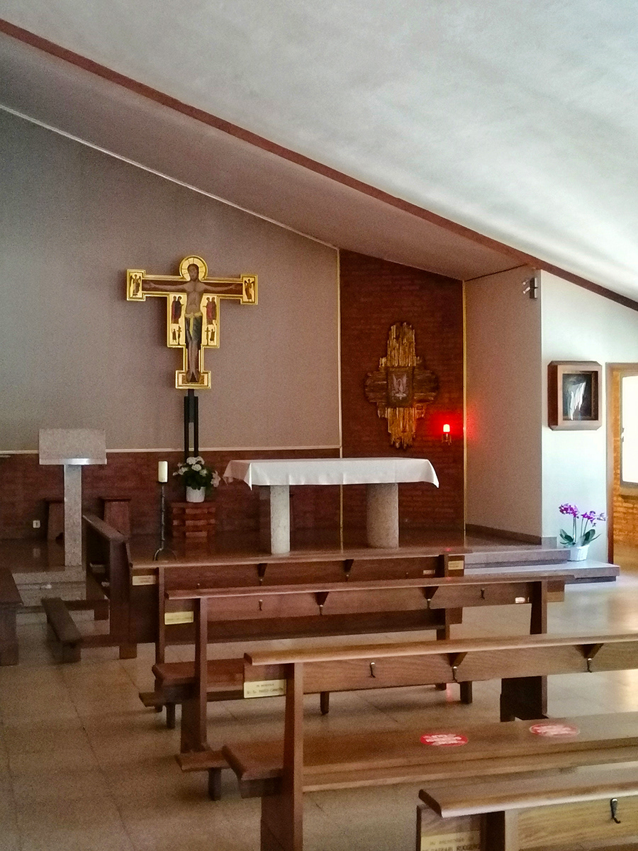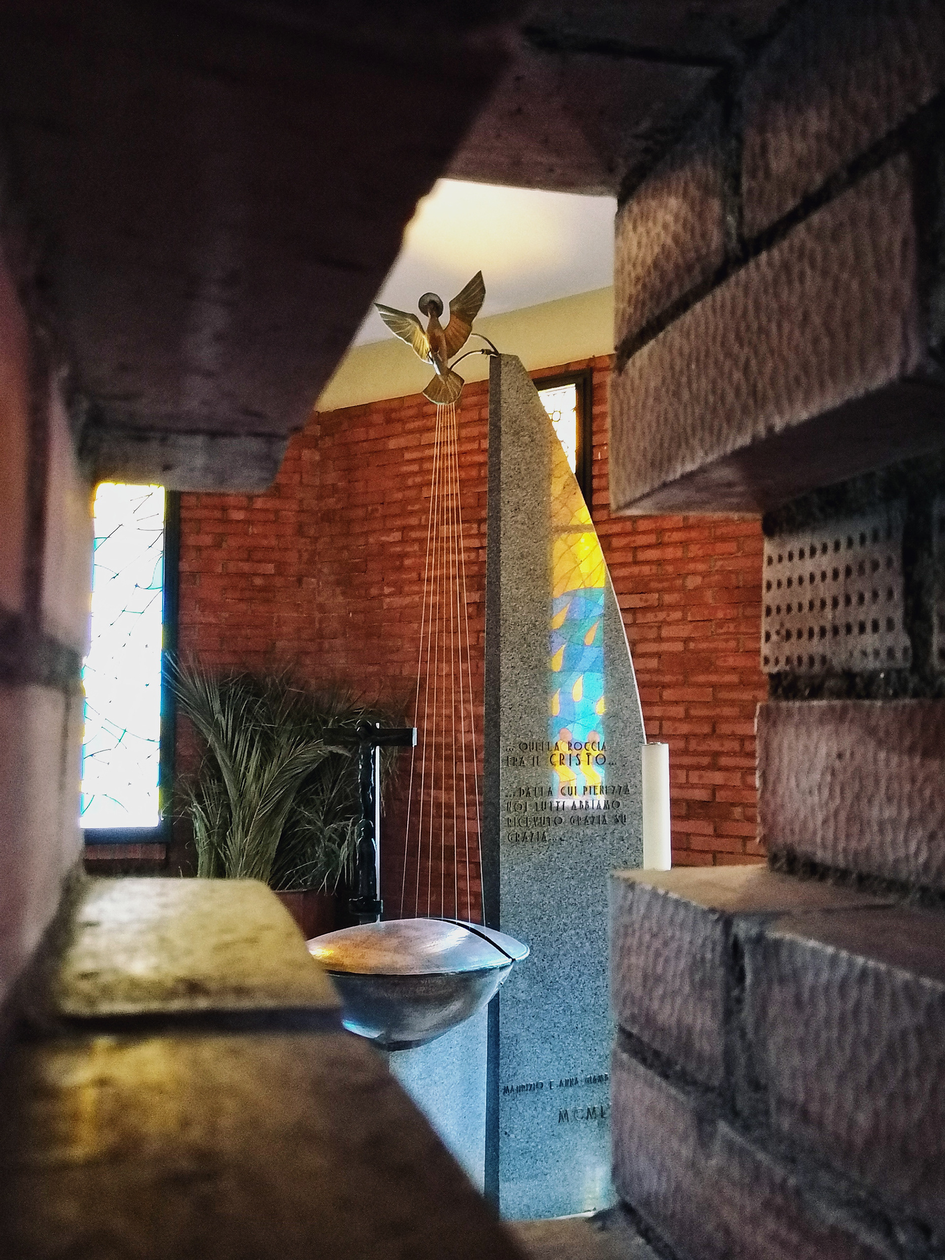 “One particular architectural detail is the remarkable optical effect produced by the two columns that together with the support beams of the bell tower form the letter “M”, the initial of the name of Maria. “ [1] The hanging Christ on the Cross above the altar was created by Italo Costantini and has quite a powerful visual effect.