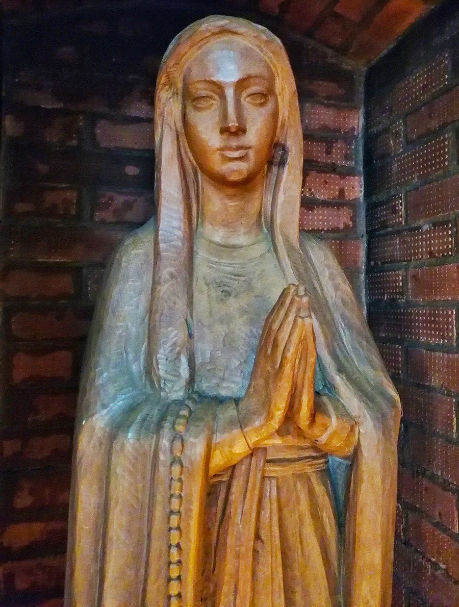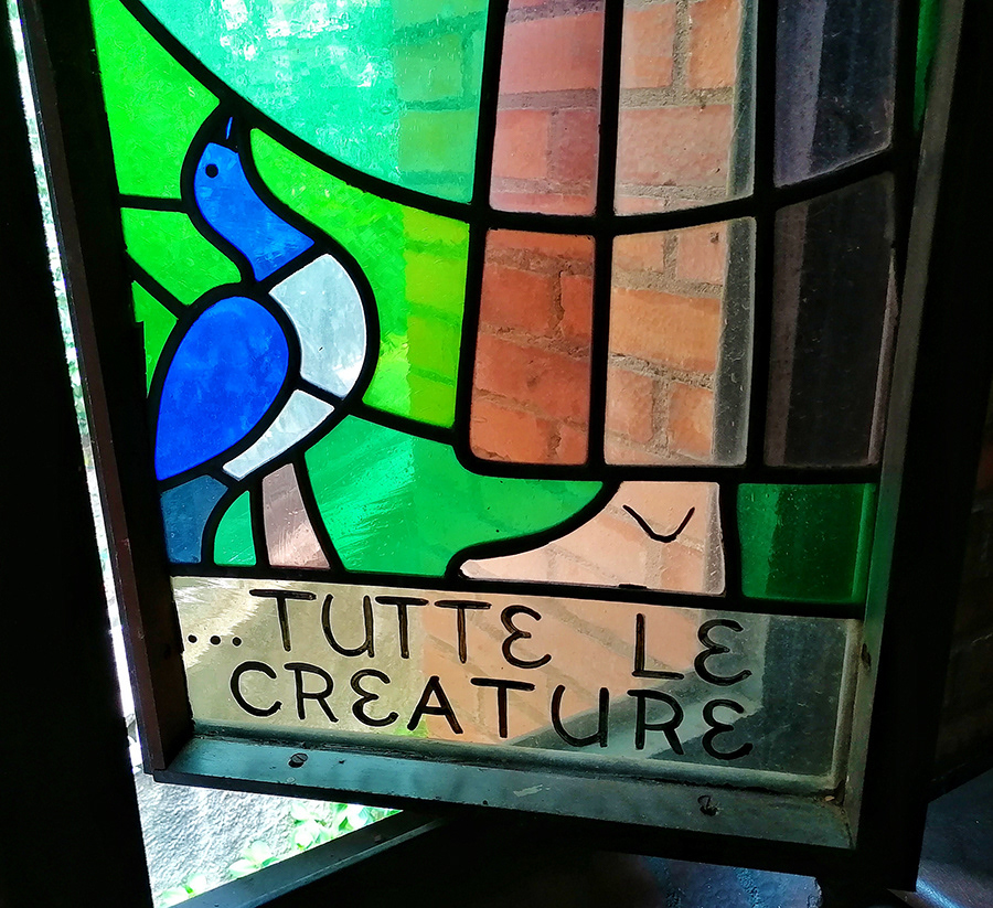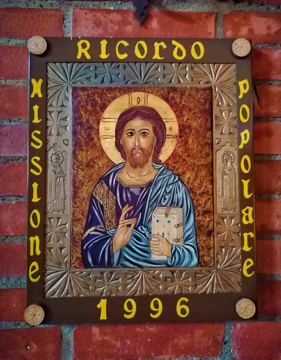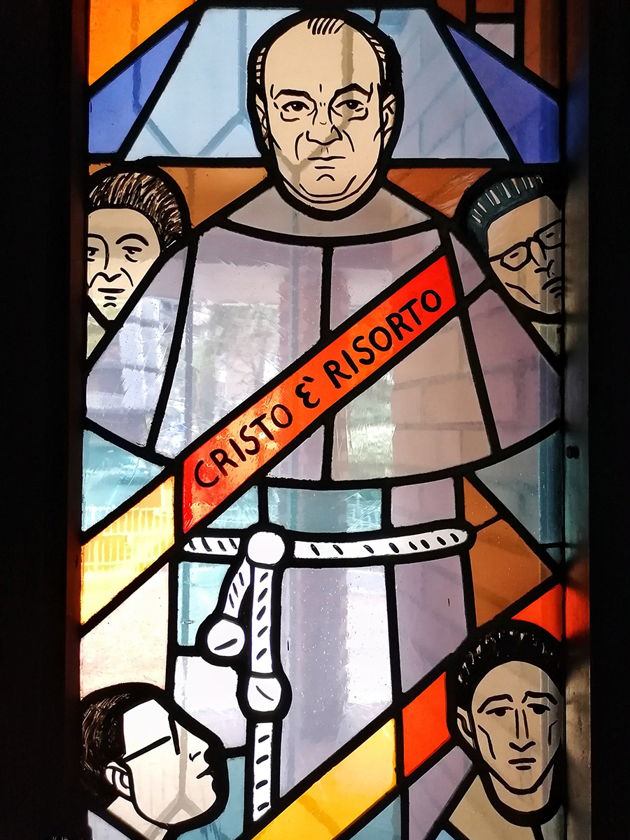 “One particular architectural detail is the remarkable optical effect produced by the two columns that together with the support beams of the bell tower form the letter “M”, the initial of the name of Maria. “ [1] The hanging Christ on the Cross above the altar was created by Italo Costantini and has quite a powerful visual effect.
