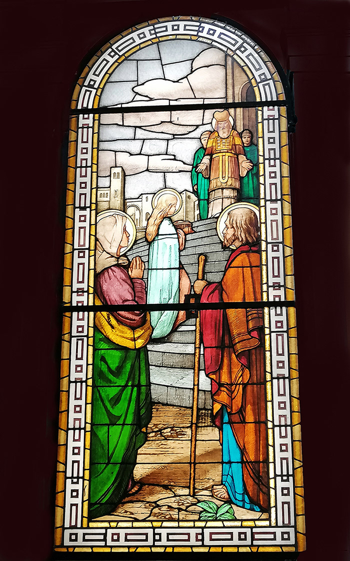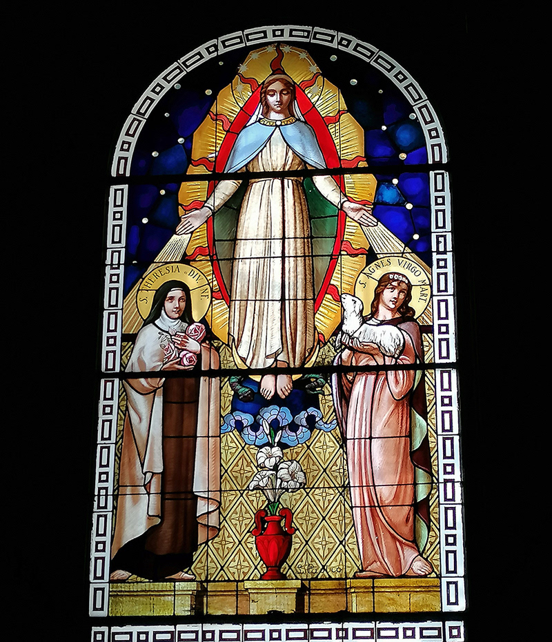 You will notice two beautiful stained glass windows. The one on the left represents the Crucifixion. The one on the right, dated from 1932, depicts a scene with Virgin Mary, Saints Joachim and Anne, children Jesus and John the Baptist.