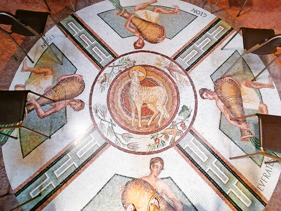 The interior has a longitudinal plan and a single nave. Pay attention to the decoration of the floor and nave (incredible mosaic).