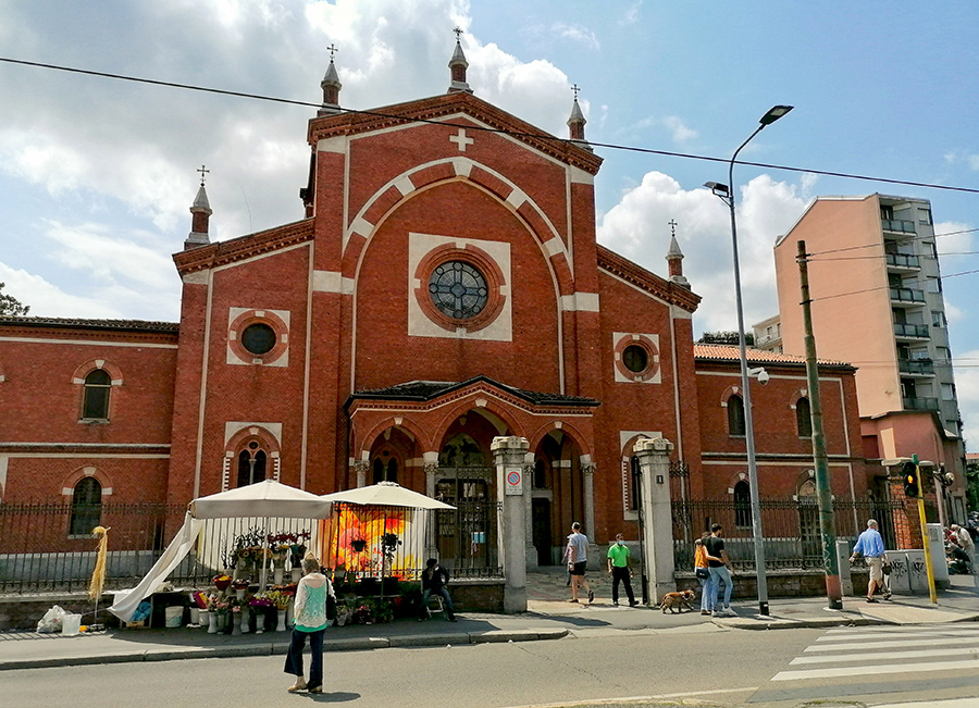 The terracotta façade is enriched by a beautiful portico. The peripheral church is constructed in red bricks as well as the sides of the church.