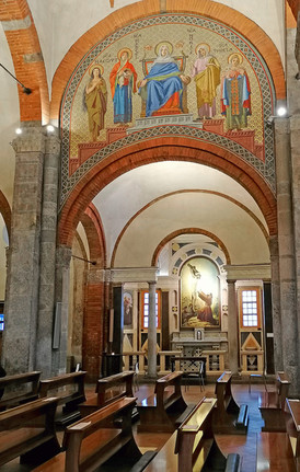 As mentioned before, the fresco on top of the altar depicts Saint Babila and the three boys (Urban, Prilidianus and Epolonio, sons of Teodula) with whom he was martyred, under the rule of Emperor Decius in 250 AD, and is the work of Luigi Cavenaghi, well known Italian painter. The baptismal font, decorated with angels holding the silver robe resting on a quartz block is as well a great piece of art. [2]